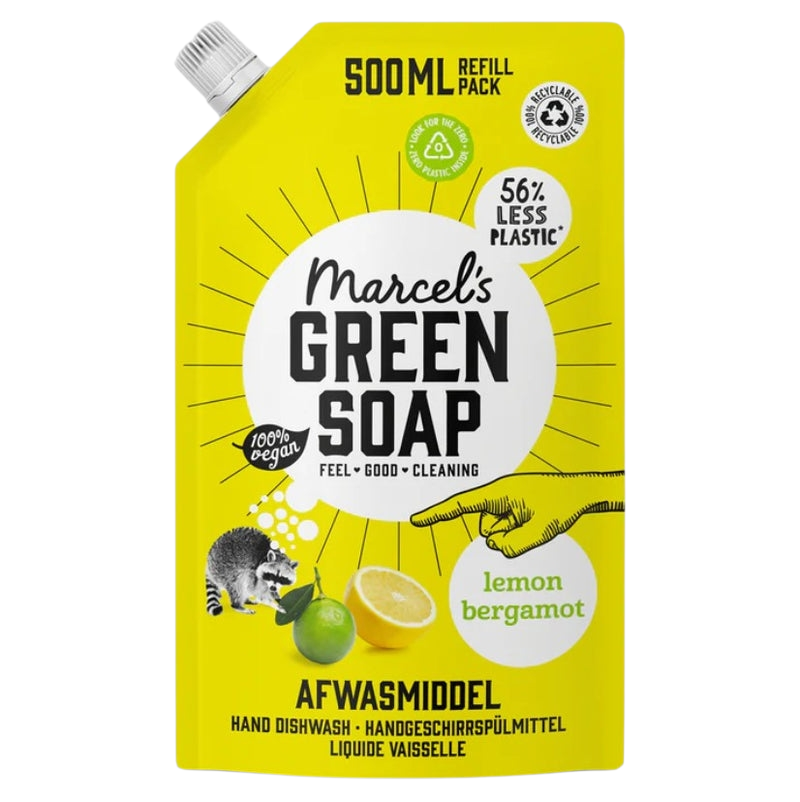 Marcel's Green Soap Afwasmiddel voor een stralend schone vaat. Met de heerlijke geur van Citroen & Bergamot voor een verfrissend en ontspannen handafwasje. Met deze voordelige navulverpakking bespaar je 56% plastic t.o.v. de fles