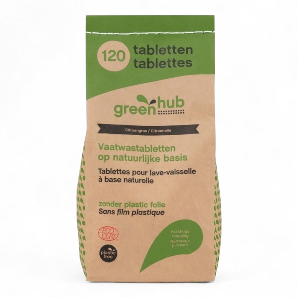 Greenhub vaatwastabletten reinigen je vaat krachtig schoon, vanaf 40°C. Ze zijn volledig biologisch afbreekbaar, vrij van plastic folie en gemaakt met zorgvuldig geselecteerde, natuurlijke ingrediënten die voldoen aan de hoge eisen van het Ecocert-keurmerk. Een slimme keuze voor een stralend schone vaat én een lagere impact op het milieu.