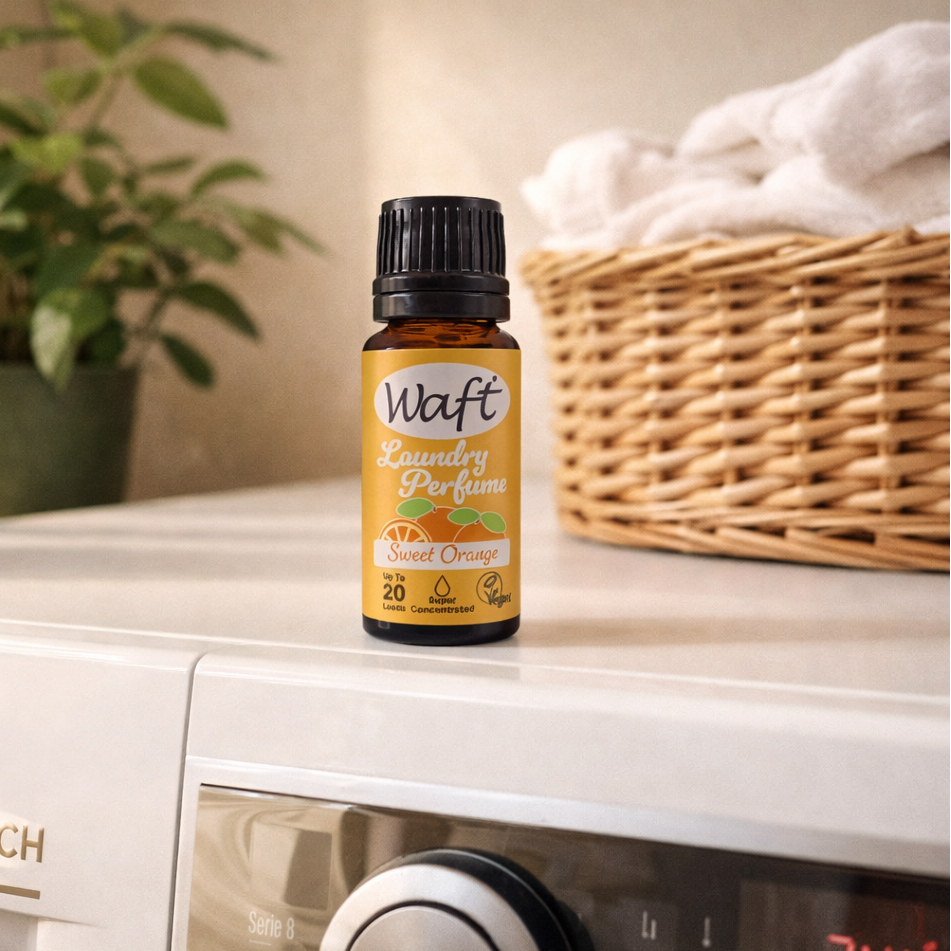 Waft geconcentreerd wasparfum met frisse sinaasappelgeur is een mooi en bewust alternatief voor conventionele wasparfums en wasverzachters.