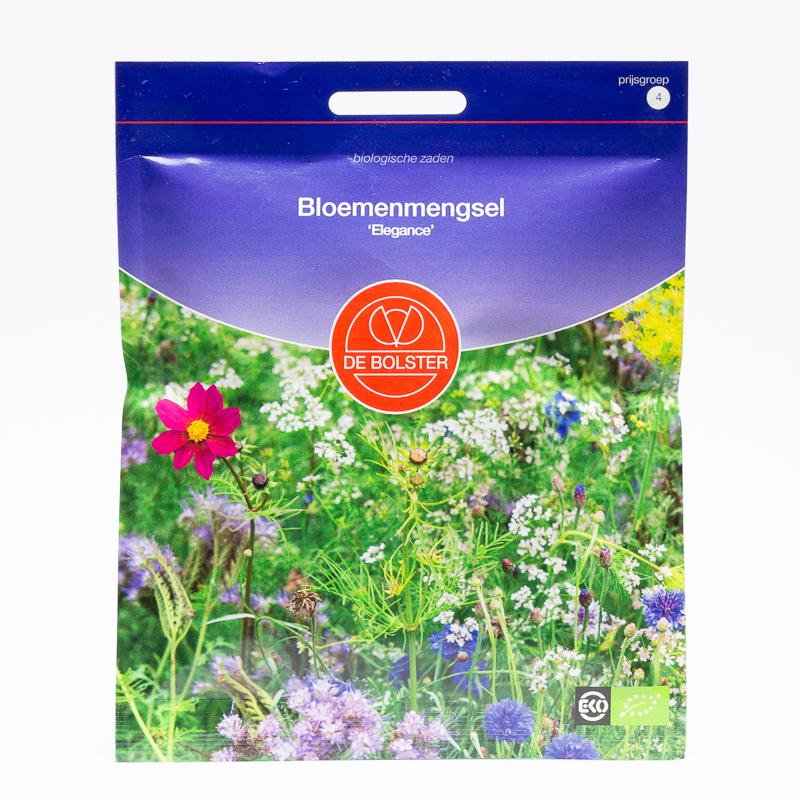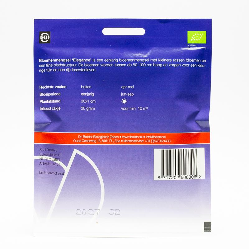 De kleuren wit, roze, paars en blauw in het bloemenmengsel 'Elegance' gaan samen met een vleug oranje. De vroege bloeiers zoals phacelia, koekruid, worden opgevolgd door koriander, goudsbloem, dille en korenbloem. Cosmea zorgt voor een zeer langdurige bloei tot diep in het najaar. Het mengsel bereikt een hoogte van ongeveer 1 meter; de Cosmea komt daar in het najaar speels bovenuit.